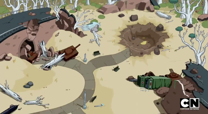 La animación de la serie, siempre está en constante cambio, debido a que las aventuras se desarrollan en diferentes lugares, pero esto es algo que se nota en mayor cantidad en las últimas temporadas que han salido. Los escenarios han tenido un papel fundamental a lo largo de esta serie, debido a que muestran algunos vestigios de lo que fue es el mundo después de la guerra de los “champiñones” (guerra nuclear). La historia de hora de aventura se desarrolla en un mundo Post-apocalíptico y con forme avanza la temporada en emisión, revelan cosas de suma importancia en la historia de esta, sean datos del pasado o del futuro, Hora de aventura está subiendo cada vez más rápido a un punto en el que cada episodio deja impactado a aquellos que han seguido la serie en orden.